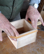 桐箱の蓋面デザインはプリントではなく焼印でデザイン処理を行っておりますので、マスキングをせずに直接塗装しウェスで拭き取って頂いて問題ありません。裏面のシール部分のみ色移りしないようマスキング処理を行って下さい。