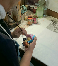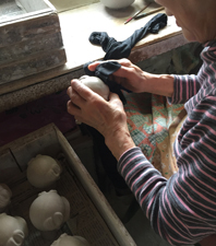 成形はガバ鋳込みという製法で、石膏型に泥漿を流し1つ1つ射込みを行い、粘土を乾燥させ、仕上げており、絵付けは人形専門の絵付け士が手塗りにて仕上げております。